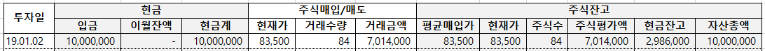 * 1월 2일 주식계좌를 열고 1,000만원을 입금하였다. 주가가 83,500원인 고영을 84주인 7,014,000원 매입했다.