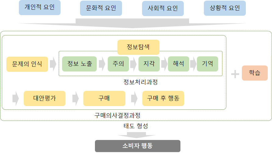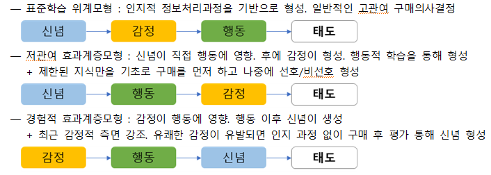 + 복잡한 의사결정과정 (신념 → 평가 → 행동), 관성적 의사결정 (신념 → 행동 → (평가))