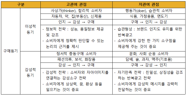 + 고관여/저관여 ~ 인지적/감성적 매트릭스(그리드)
